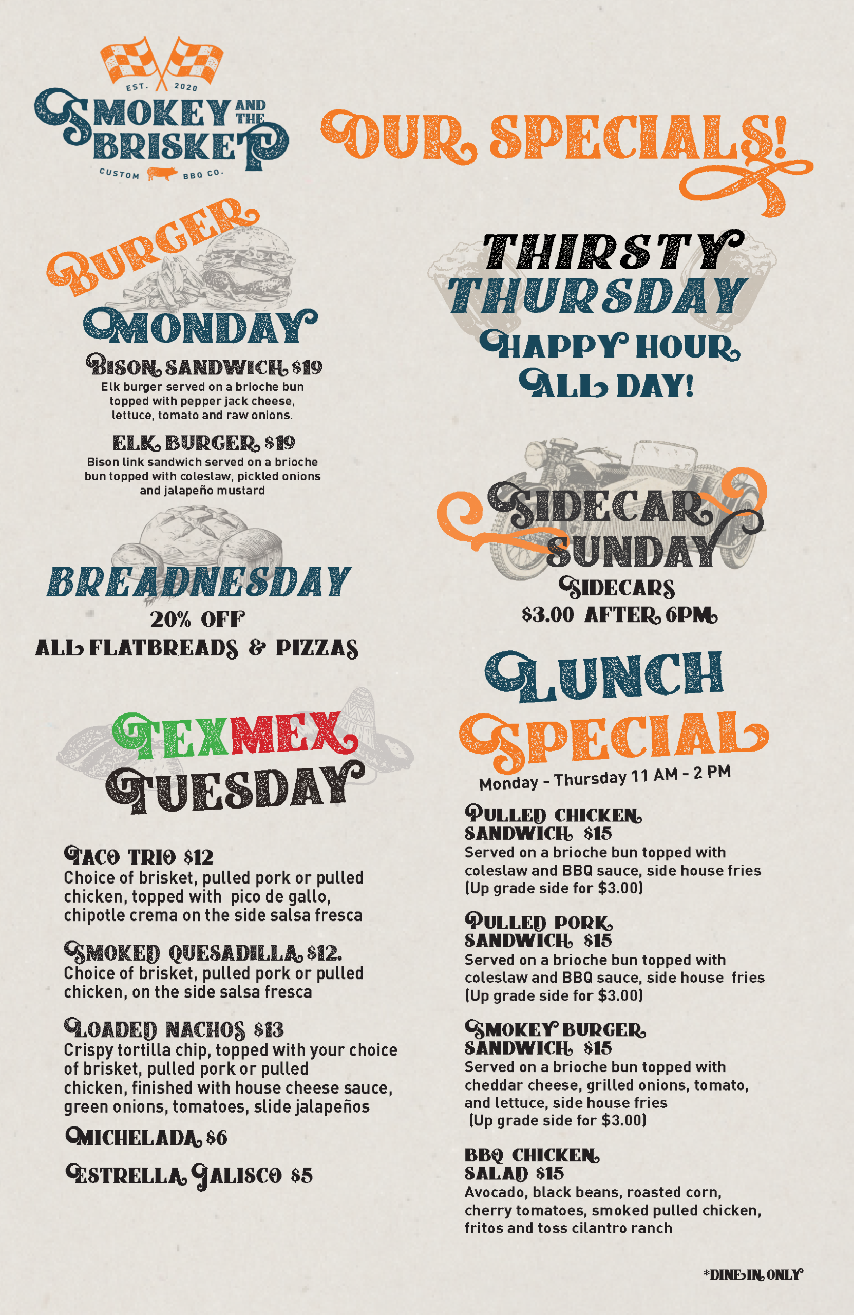 SMOKEY BURGER | 15 Served on a brioche bun topped with sharp cheddar, grilled onions, tomato and lettuce. served with fries. BELLY BACON BURGER | 17 Served on a brioche bun topped with pork belly bacon, cheddar cheese, lettuce, tomato, red onions, avocado and ranch dressing. Served with fries. STOP YOUR ENGINES BURGER | 17 Served on a brioche bun topped with pulled pork , pork belly bacon, fried red onions strings, pepper jack cheese, BBQ sauce. Served with fries.